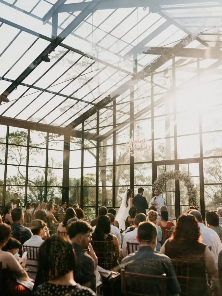 Se a cerimônia for ao ar livre, é importante aproveitar o cenário natural: árvores, gramados, lagos e vistas panorâmicas se tornam parte da composição visual. Já em espaços cobertos com amplas janelas de vidro, a iluminação do pôr do sol cria um espetáculo visual sem igual.